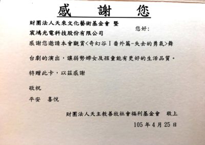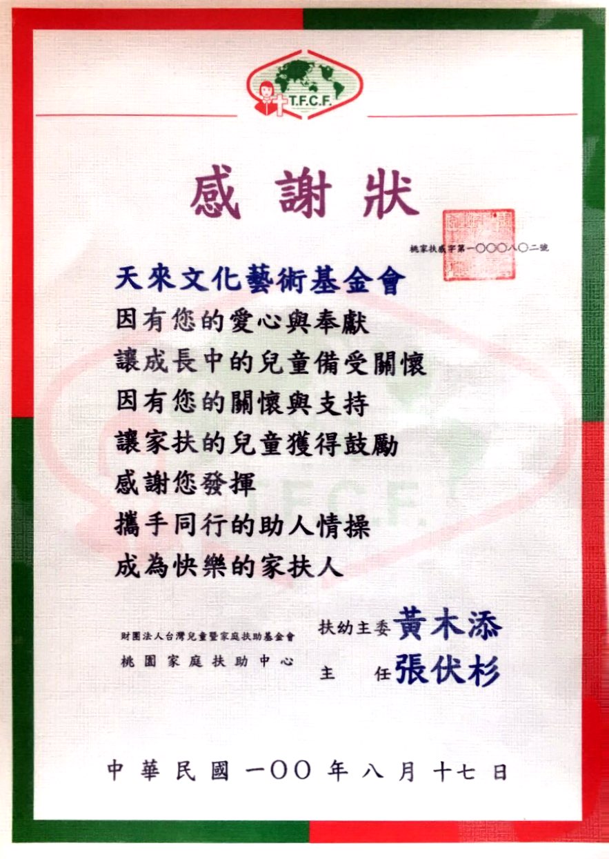 感謝與分享 關於天來 執行長的話 董事會成員 天來大事記 感謝與分享 歌舞劇 灰姑娘不丟玻璃鞋 公益贊助 用愛環抱海洋 萬人淨灘活動 台北市私立體惠育幼院 基督教台北市私立伯大尼兒少家園 台北兒童福利中心 天主教善牧社會福利基金會 奇幻谷1 失去的勇氣 普立茲特展 / 政治大學新聞系 基督教芥菜種會愛心育幼院 奇幻谷1 失去的勇氣/ 國際單親兒童文教基金會 台灣觀光學院 會動的清明上河圖/新北市三峽區大成國小 桃園家扶中心 會動的清明上河圖/新北市金山區中角國小 會動的清明上河圖/伊甸社會福利基金會 陽光社會福利基金會 會動的清明上河圖 會動的清明上河圖/新北市瑞芳區瑞柑國小 會動的清明上河圖/宜蘭縣蘇澳鎮永樂國小