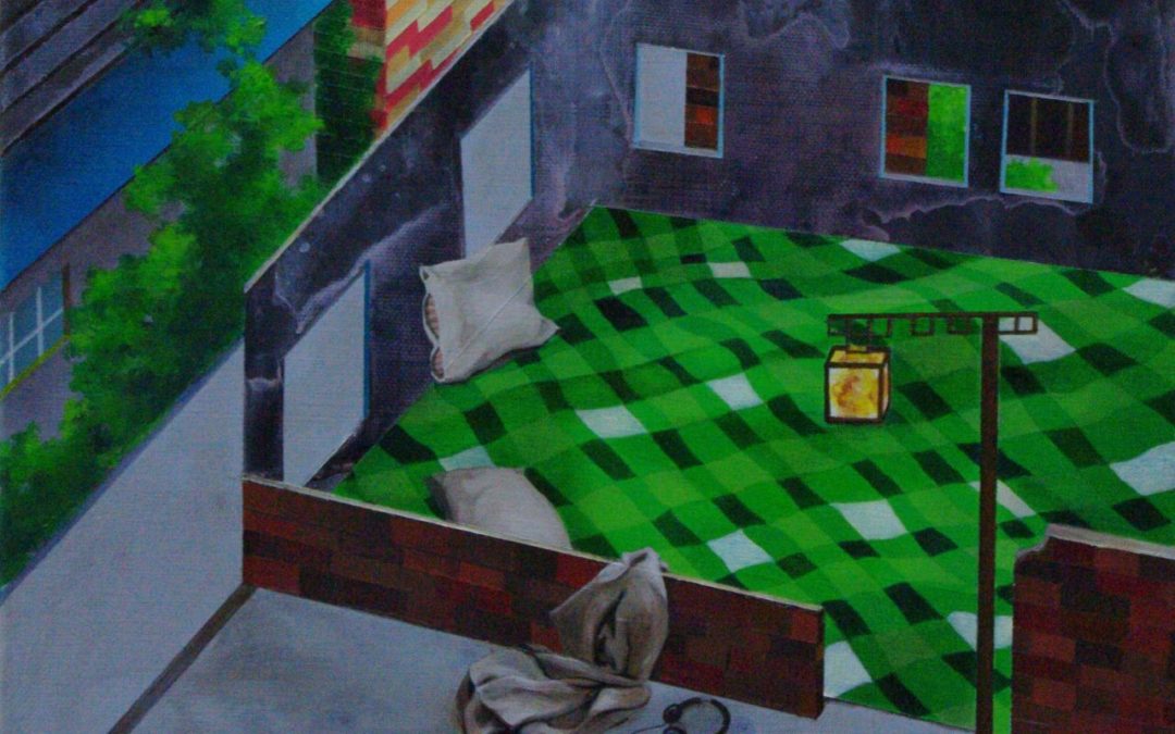 這些場景來自於生活環境的周遭,有時我們會花很久的時間去使用它們,或者只是匆匆的經過。一開始是抱持想要擁有的情感,所以我將這些大的空間場地,收納入小尺寸的畫布中,試圖著去彌補短時間的擁有體驗,我擷取它們的一部分,加以放大細察,或是流露著某人使用過後的痕跡,不知道上一秒它們是以怎樣的狀態存在著,我在當中加入些個人的想像,以不同的角度去重新觀看,並組合這些場域,給予一種場域的似曾相識感。