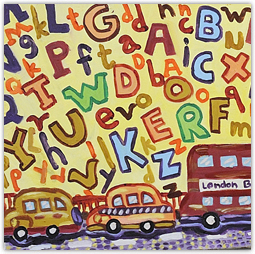 我去英國看到好多金髮閉眼的外國人,還有先紅色的雙層巴士和黑色的計程車。所以我就在畫布上畫了許多英文字母的大小寫!下面還有三台車子。