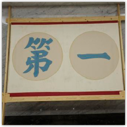 醒目的標語字形「第一」,濃烈的民族抽象色彩,繪聲又繪影,幽默到訪的來賓,以第一為聯想做起始句。帆布撐起「第一」的字樣,是民族英雄式的歡呼,讓抽象的聲音在空間傳導。