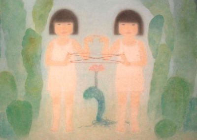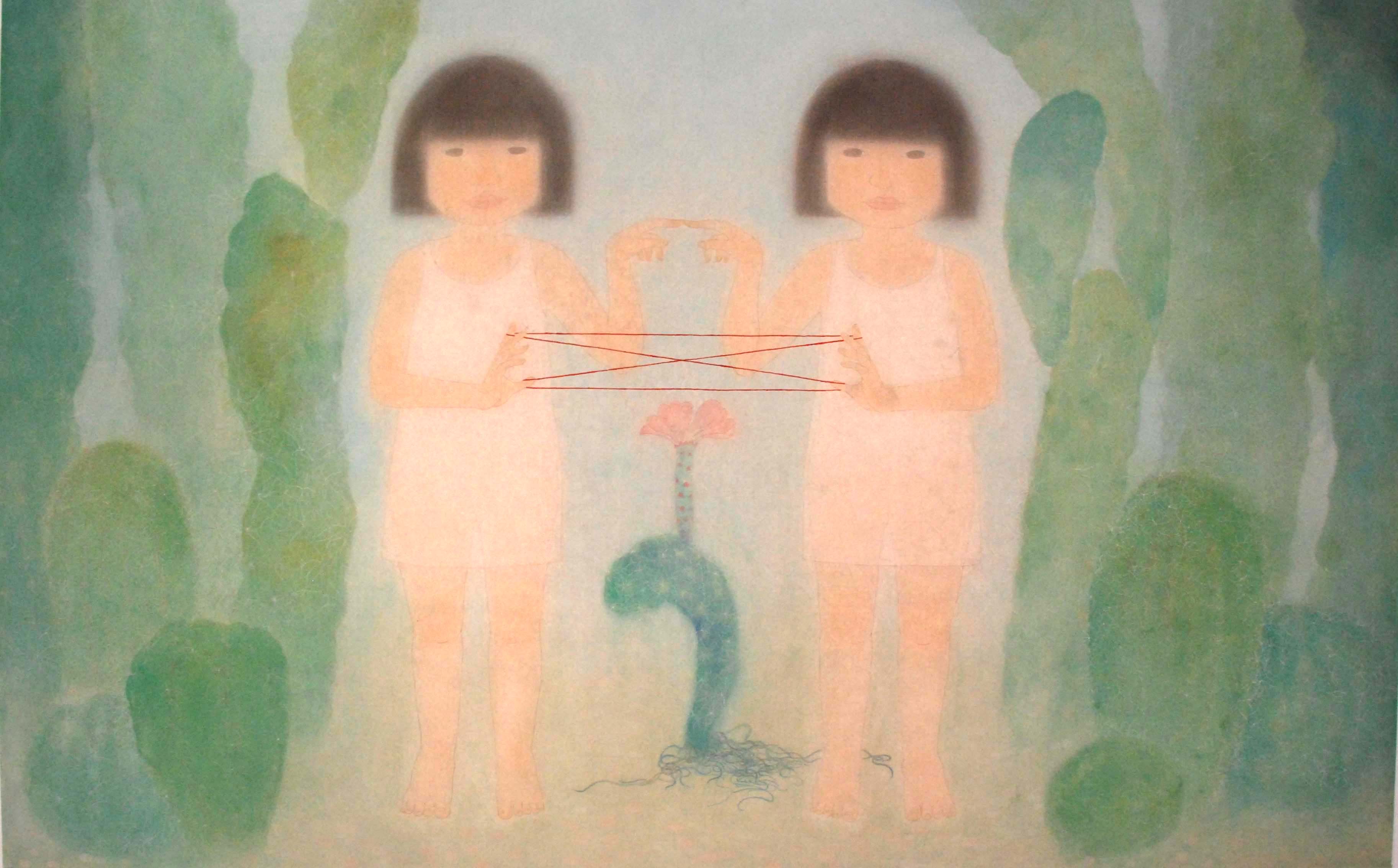 指尖連結的連體嬰、結繩的遊戲,象徵兩者的牽絆性,似乎是可輕易剪斷的連結,卻還是會感到疼痛,因此停留在僵持中的平衡狀態。仙人掌細毛般的包覆,看似柔軟,同時又隱含著危機感,烘托出美好卻隱含危險的氛圍。